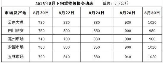 2016年7月25日,鑒于重樓人工種植及野生資源供給量持續下降、家種難以支撐以及企業批量采購等影響,上周重樓已突破千元大關。隨著重樓集中產新結束,重樓價格行情在8月下旬開始發動,從740元-790元(公斤價,下同)價位一路上行,到8 月30日已經達到960元-1020元高位,漲幅高達30%以上!
